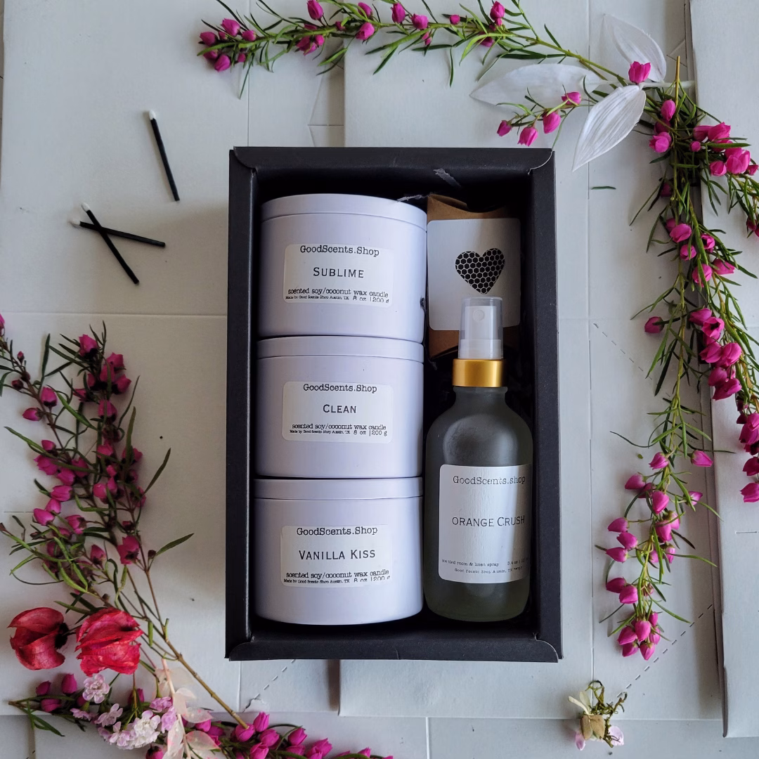 If you're like us, it's hard to settle on just one scent - we want them all! So, we created sampler sets that can be gifted or used for personal enjoyment. Each Good Scents Shop Sampler Gift Set includes three candle tins and one room and linen spray designed to be used individually or combined as scent zones. For example, you can use one candle in the restroom, one in the living room, and one in the kitchen. The room and linen spray is perfect when you need a fresh scent without waiting for the scent throw from your candles.